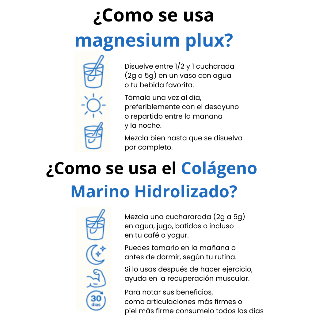 Incorpora Magnesium Plux y Colágeno Hidrolizado en tu rutina diaria con pasos simples y rápidos. Solo necesitas agua o tu bebida favorita para comenzar a sentir los beneficios. ¡Haz del bienestar un hábito!